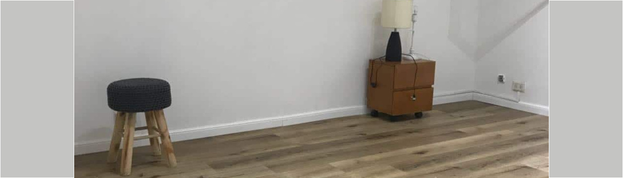 Este tipo de piso se puede instalar con los zócalos puestos, ya que puede pasar por debajo, solo hay que preocuparse de poner un cuarto de moldura para poder disimular el encuentro.